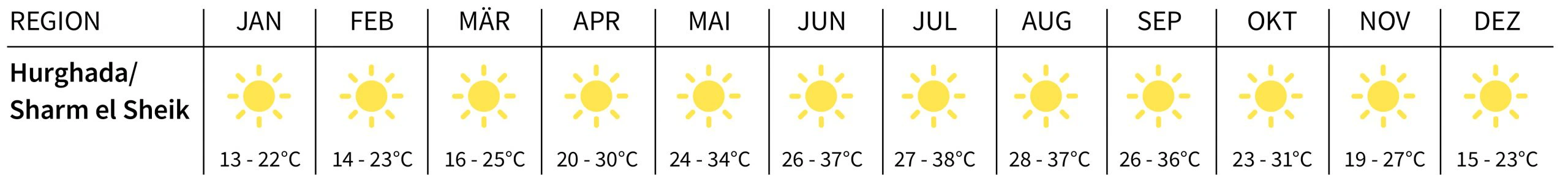 In Ägypten gibt es nur zwei Jahreszeiten, Sommer und Winter, die beide ein halbes Jahr dauern. In den Sommermonaten von Juni-September ist es tagsüber sehr heiß, besonders im Landesinneren.