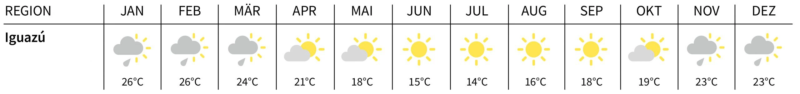 Im Norden von Argentinien, bei den Iguazú Wasserfällen, herrscht ein tropisches Klima. Hierher können Sie das ganze Jahr über reisen, es ist meistens warm und feucht. Im Winter fällt weniger Regen, aber die Temperatur kann tagsüber bis zu 15°C betragen. Wenn Sie weiter nach Westen reisen (Richtung Chile), wird die Landschaft immer trockener. Im Nordwesten Argentiniens befindet sich die Hochlandebene um die Stadt Salta. Obwohl die Nächte im Winter sehr kalt sind, sind die Temperaturen tagsüber viel angenehmer als im Sommer, denn dann steigt die Temperatur am Tage manchmal auf über 40°C.