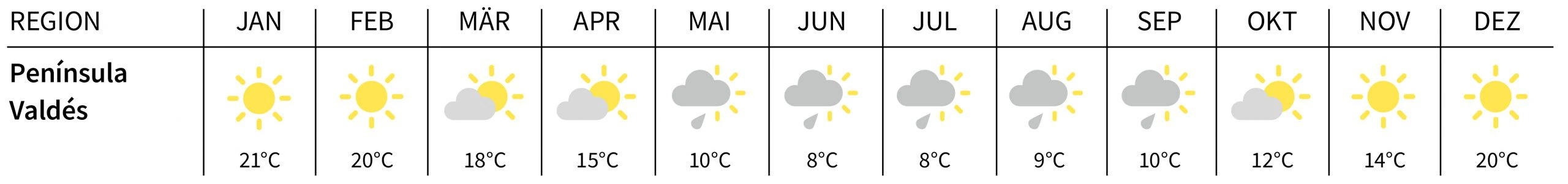 Auf der Halbinsel Valdés können Sie das ganze Jahr über Seehunde, Seelöwen, Seeelefanten und verschiedene Vogelarten sehen. Von Juli bis Anfang Dezember halten sich wandernde Pottwale, Buckelwale und Orkas in der Nähe der Küste auf. Von September bis März gibt es hier Pinguine zu sehen. Die beste Reisezeit für einen Besuch der Halbinsel ist unserer Meinung nach September bis November, also im Frühling. Dann ist Brutzeit, männliche Tiere kämpfen um die Weibchen, Pinguine gehen an Land, um Ihre Eier auszubrüten und die Orkas jagen an der Küste nach Seehunden.