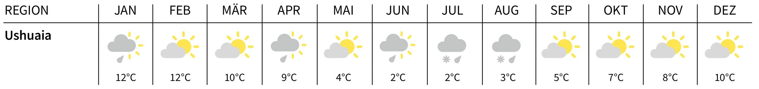 Die beste Reisezeit für Patagonien und Feuerland sind die Sommermonate von November bis Februar. Dann ist die Wahrscheinlichkeit für gutes Wetter dort höher und die Tage sind sehr lang. In Feuerland können die Temperaturen dann jedoch immer noch auf 4 bis 5 Grad sinken. Im argentinischen Winter (von Juni bis August) ist es in Patagonien sehr kalt. Viele Unterkünfte sind dann geschlossen, Busse fahren seltener und manche Ausflüge werden nicht durchgeführt. In Ushuaia gibt es inzwischen im Winter eine florierende Skisaison. Wir waren selber in der Zwischensaison hier (September/ Oktober, April/ Mai) und haben das Wetter als sehr abwechslungsreich erlebt. Letztendlich gehört in Patagonien einfach ein bisschen Glück dazu. Das Wetter kann sich von Stunde zu Stunde vollkommen ändern. Nehmen Sie auf jeden Fall immer warme Kleidung mit nach Patagonien, egal ob Sie im Dezember oder im Juli verreisen.