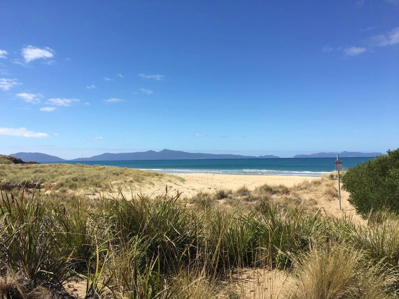 Was wir nicht ahnten war, dass es gerade nur einmal 15 Minuten gedauert hat, bis wir unseren ersten Stopp einlegten. Nachdem wir die Hauptstraßen von Hobart verlassen hatten, wartete nämlich schon der erste traumhafte Strand auf uns und das direkt vor der Stadt. Ich halte es kurz: Aus 2,5 Stunden Fahrtzeit sind es fast 5 geworden, weil es so viel zu entdecken gab. Am frühen Nachmittag erreichten wir das Ortsschild von Bicheno und wer hätte es gedacht, wieder wartete ein paradiesischer Strand mit kristallklarem Wasser auf uns. Nach den vielen Eindrücken auf der Fahrt freuten wir uns auf eine Abkühlung, checkten schnell in unserem Guest House ein und liefen mit Badehose und Handtuch bewaffnet die paar Meter bis zum Strand. Ich muss ehrlich gestehen, dass ich Meerwasser in Badewannentemperatur bevorzuge. Die Temperatur des Wassers in Bicheno fiel, nach einem schnellen Fuß-Temperaturcheck, eher in die Kategorie Gefrierschrank und das bei strahlendem Sonnenschein und 26 Grad. Wagemutig wie wir sind haben wir uns dann aber doch ins Wasser getraut.