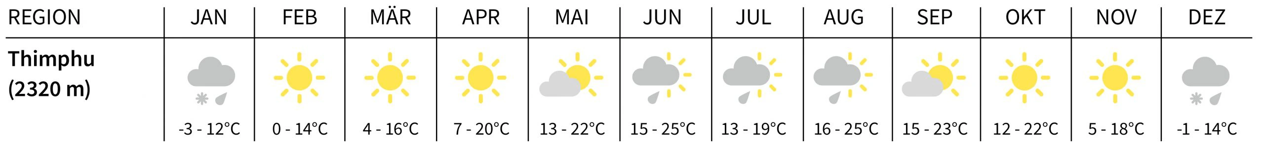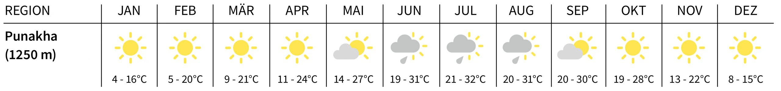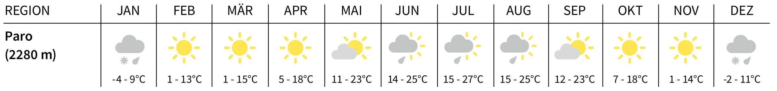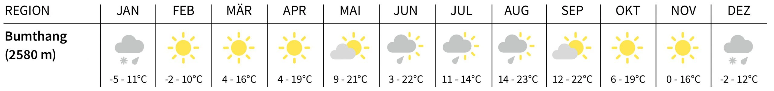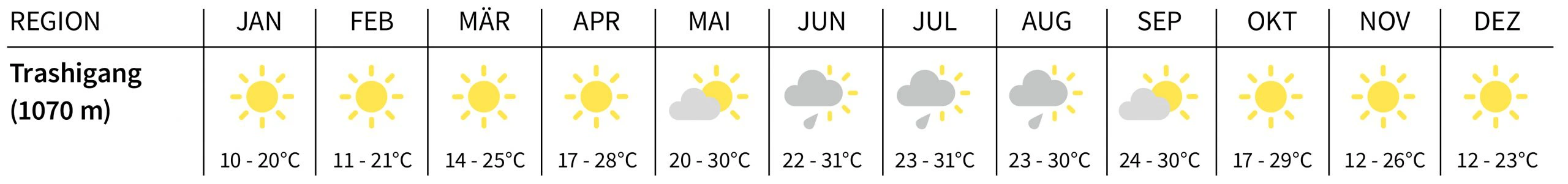 Beim Klima in Bhutan denken viele hauptsächlich an Kälte. Da Bhutan aber auf demselben Breitengrad wie Florida und die Kanarischen Inseln liegt, herrscht hier das ganze Jahr über ein angenehmes Klima. Die Temperaturen liegen durchschnittlich zwischen 15 und 20 Grad Celsius und in den Sommermonaten kann es im Süden bis zu 30 Grad warm werden. In diesem Zeitraum liegen die Temperaturen und die Luftfeuchtigkeit höher und nachts kann es oft zu Regenfällen kommen. Solche Wetterbedingungen sind weniger gut für ein Trekking geeignet. Die Pfade sind rutschig und die Sicht ist schlecht. In den Tälern Zentralbhutans herrscht ein gemäßigtes Klima mit kühlen Wintern und heißen Sommern. Lediglich im Gebirge sind die Winter extrem streng und die Sommer kühl.