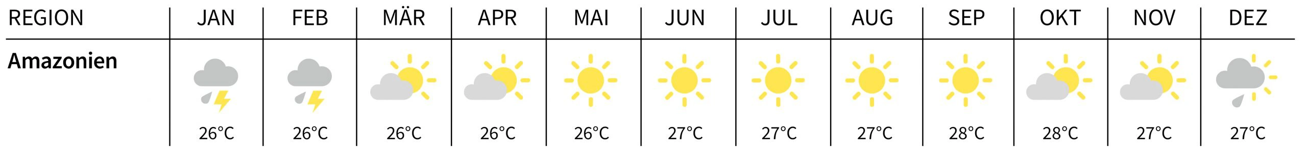 Amazonien: Die beste Zeit für einen Besuch ist von Juni bis September, es ist jedoch das ganze Jahr über heiß und feucht. In der Mittagszeit kommt es häufig zu starken Regenfällen. Morgens und nachmittags ist es meistens sonnig.