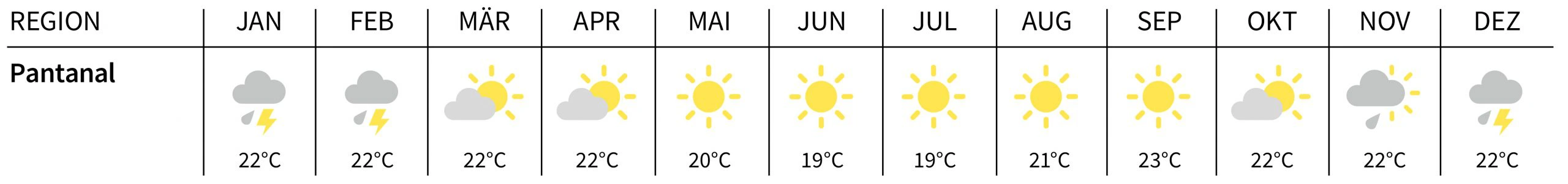 Das Pantanal ist von Mai bis September sehr heiß, mit Temperaturen von teilweise über 40°C. Im Oktober beginnt die Regenzeit, die sich bis März zieht. Aufgrund des Regens ist es in dieser Zeit schwieriger zu reisen und es sind in der Regel weniger Tiere zu sehen. Die beste Reisezeit um Tiere zu beobachten ist von Juni bis Oktober, die Straßen sind passierbar und die Tiere ziehen sich in die Wasserlöcher zurück.
