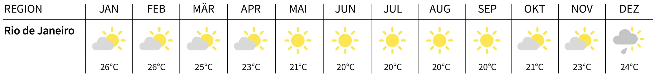 Im brasilianischen Winter – Juni bis September – ähnelt das Wetter in Rio und Umgebung dem nordeuropäischen Sommerwetter: Es gibt bewölkte Tage mit Regen, aber auch Perioden mit viel Sonne. Wenn Ihre Brasilien Reise Sie weiter in den Süden führt, dann wird die Temperatur in dieser Jahreszeit niedriger.