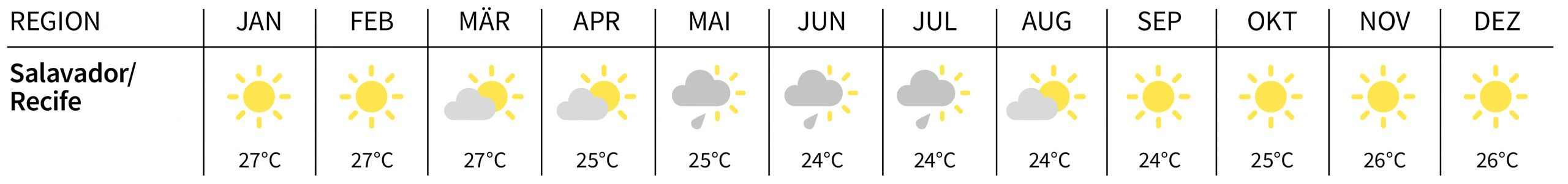 Im tropischen Nordosten Brasiliens gibt es zwei Jahreszeiten, aber davon merkt man kaum etwas. Die durchschnittliche Temperatur liegt das ganze Jahr über bei 25°C und fällt auch im brasilianischen Winter nicht unter 22° C. Von März bis August fallen die meisten Niederschläge.