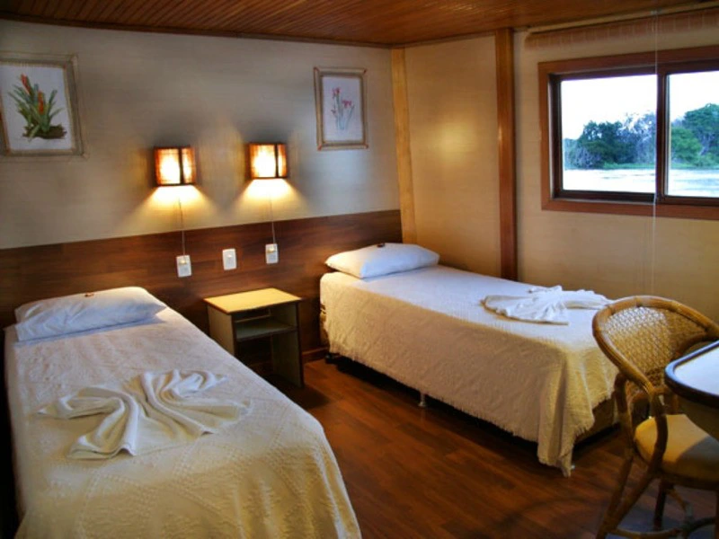 Auf dieser Reise verbringen Sie die Tage an Bord eines typischen Amazonas-Bootes. Dabei handelt es sich nicht um ein Kreuzfahrtschiff, sondern um ein speziell für den Amazonas ausgerüstetes Boot, das dank seines geringen Tiefgangs in die engen Nebenflüsse des Amazonas hineinfahren kann. Die Kabinen sind geräumig und das Sonnendeck lädt zum Verweilen ein. Von hier aus haben Sie einen weiten Blick über den dichten Amazonas-Dschungel und können den Geräuschen des Dschungels lauschen. Das Premiumboot verfügt über vier Decks mit insgesamt 16 Außenkabinen, einem Restaurant und einem Loungebereich. Die Kabinen sind komfortabel ausgestattet mit eigener Dusche/WC und Warmwasser, Klimaanlage und Safe.