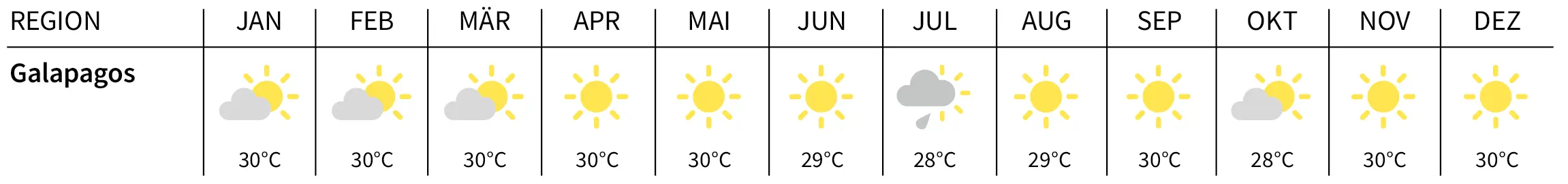 Glücklicherweise kann man alle Tiere der Galapagosinseln das ganze Jahr über beobachten, also brauchen Sie das bei der Wahl einer geeigneten Reisezeit nicht zu berücksichtigen. Wenn Sie während Ihres Besuches der Inseln auch noch im Meer baden möchten, sollten Sie Ihre Reise in der warmen/feuchten Saison von Januar bis Mai planen. Außerhalb dieser Jahreszeit kann das Seewasser sehr kalt sein und beim Schnorcheln wird ein Neoprenanzug benötigt. Ab und zu kann Nebel aufkommen und das Meer ist etwas unruhiger.