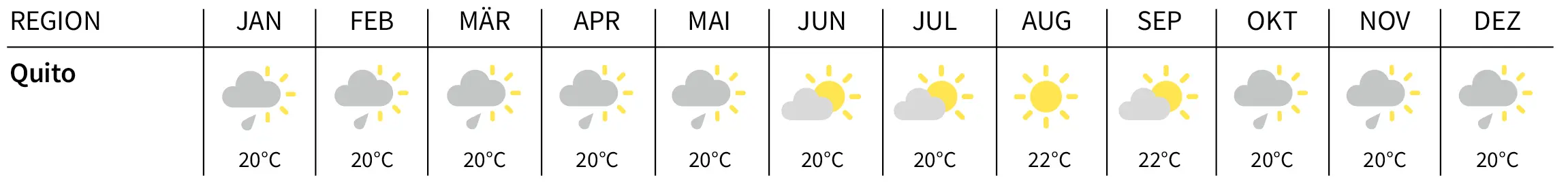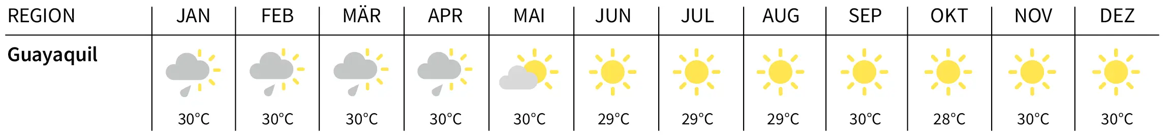 Ecuador ist ein Land, das man das ganze Jahr über bereisen kann. Weil es in der Nähe des Äquators liegt, ist es eigentlich nie richtig kalt und wegen der Höhenlage auch nicht extrem warm. Obwohl die Ecuadorianer etwa gleiche Ferienzeiten haben wie wir, ist die beste Zeit für eine Ecuador Reise – und daher auch die Hochsaison – auf dem Festland von Juni bis einschließlich September. Die Tiere auf den Galapagosinseln kann man das ganze Jahr sehen. Von Februar bis Mai herrscht dort das angenehmste Klima, da die Temperaturen hoch sind und der Wellengang etwas schwächer.