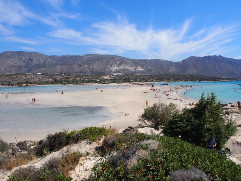 Über eine flache Sandbank gelangt man zur Insel Elafonissi mit ihrem langgezogenen Strand, Sanddünen und ungewöhnlichen Pflanzen. Die Sandfarbe variiert von puderweiß bis zu rosa, weshalb Elafonissi häufig auch „Pink Beach“ genannt wird. Über die weitläufigen Strände und das flache Wasser lässt sich sehr gut spazieren gehen. Es gibt dort nicht viele Schattenplätze, deshalb sollte man an Kopfbedeckung und Sonnenschutz denken. Elafonissis Strände sind sehr beliebt, doch die Menschenmassen verlaufen sich, so dass das Gesamterlebnis sehr authentisch bleibt.