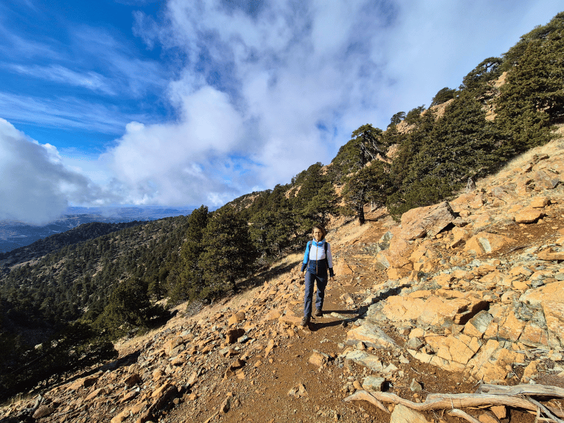 Wer gerne wandert, findet im Troodos-Gebirge einige kürzere bis längere Touren. Wir haben uns für eine Umrundung des Olymp über den Artemis-Trail entschieden. Es ist eine entspannte Rundtour mit kaum Steigungen. Ein Teil der Strecke führt durch Wälder, teils an Bäumen vorbei, die von üppigen Flechten behangen sind und sehr stimmungsvoll wirken. Ein anderer Teil der Strecke führt über einen offenen Bereich, sodass Sie die weite Aussicht über die umliegenden Berge genießen können.