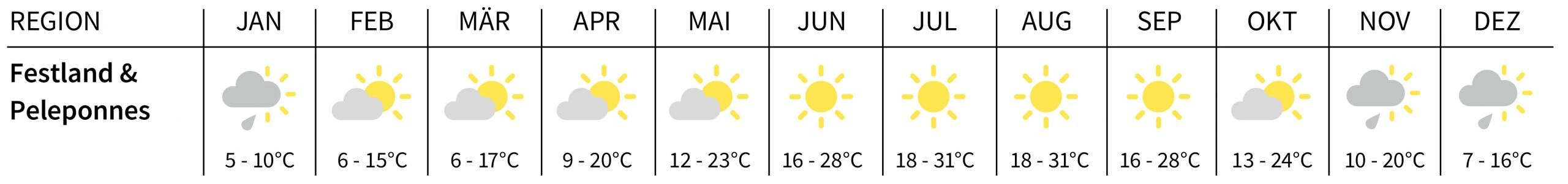 Auf dem griechischen Festland und dem Peloponnes kann es in den Monaten Juli und August bei über 30 Grad auch im Landesinneren sehr warm werden. Im hügeligen Binnenland des Peloponnes ist der Sommer angenehm, mit einer Temperatur von etwa 25 Grad. Abends kühlt es allerdings schnell ab.