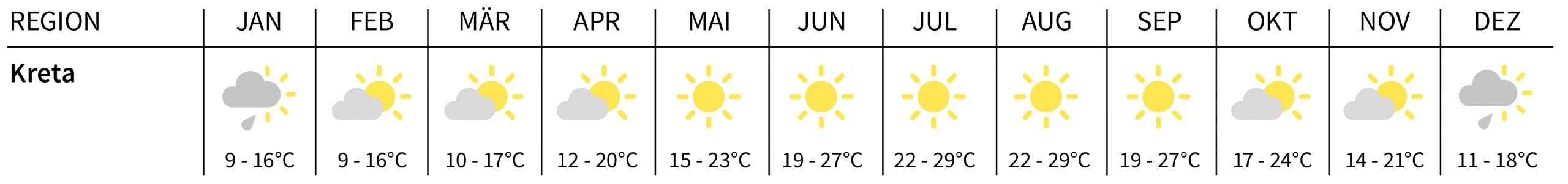 Auch auf Kreta erwarten Sie im Frühling und Herbst angenehme Temperaturen – optimal um die Insel kennenzulernen und aktiv zu entdecken. Es kann zwar ein wenig regnen, aber die Blüten sind im Frühjahr besonders schön. Die Temperaturen geben schon einen Vorgeschmack auf den warmen Sommer, das Thermometer steigt auf 30 Grad an. Wanderungen und andere Aktivitäten sind dann am Morgen oder am Abend besser. Entspannen Sie tagsüber lieber am Strand mit einer erfrischenden Meeresbrise.