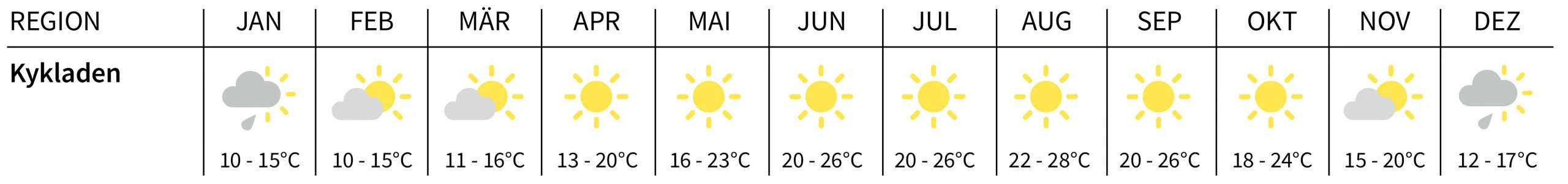 Auf den Kykladen und den Ionischen Inseln herrscht ein mediterranes Klima mit trockenen Sommern und nassen Wintern mit milden Temperaturen. Im Sommer weht eine angenehme Meeresbrise über die Inseln. Im Frühjahr ist der Himmel strahlend blau und wolkenlos, die Temperaturen angenehm und die Natur steht in voller Blüte. Das Meerwasser kann noch etwas kalt sein – ideal für ein erfrischendes Bad.