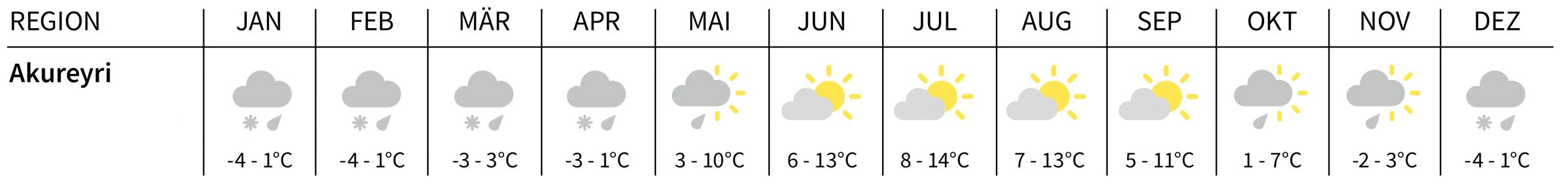 Hinter den großen Eiskappen, in der Region der Ostfjorde und am Mývatn See ist es sonniger und trockener und es fällt jährlich 400 bis 600 mm weniger Niederschlag als bei uns. Aber hier ist es oft etwas windiger und kälter. Nachts kann die Temperatur auf etwa null Grad fallen. Die Routen durch das Hochland, wie die Kjölur oder die Sprengisandur Hochlandroute nach Landmannalaugar, sind nur im Juli und August geöffnet. Im Übrigen sprechen die Inselbewohner von einer Hitzewelle, wenn das Thermometer 20˚C anzeigt.