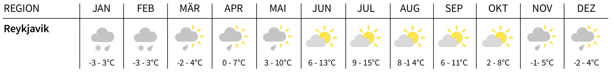 Schon der Name der Insel (engl. Iceland) lässt einen an Kälte denken. Aber in einem gewissen Widerspruch zum Namen ist es in Island häufig wärmer, als man denkt. Durch die Lage auf dem Mittelatlantischen Rücken, etwas südlich des Polarkreises, und aufgrund des Einflusses des warmen Golfstroms kann man das Klima durchaus als mild bezeichnen. Mit einer Sommer-Durchschnittstemperatur zwischen 10˚C und 15˚C lässt sich der isländische Sommer am besten mit unserem Herbstwetter vergleichen. Die beste Zeit für eine Island Rundreise sind die Monate Juni, Juli und August. Nachts kann die Temperatur dennoch bis auf 5˚C sinken.