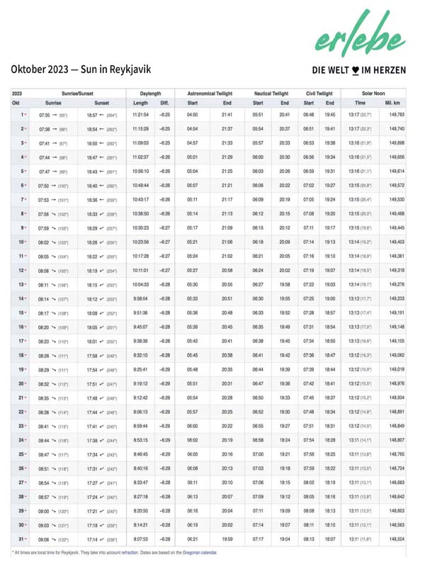 Interessant ist es aber auch, sich die die Tageslichtlänge in der Nebensaison anzuschauen. Im April sind die Tage bereits lang genug, um die Tagesetappen im Hellen zu meistern und im Mai können Sie bereits bis in die späten Abendstunden draußen sitzen. Gleiches gilt für den September bis Mitte Oktober. Klicken Sie auf die abgebildete Tabelle und finden Sie heraus, wieviel Tageslicht Sie bei Ihre Islandreise erwarten können