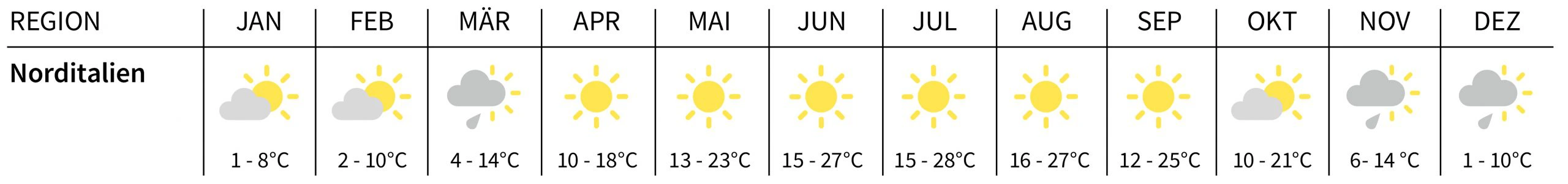 Warme Sommer und kalte Winter charakterisieren die sanften grünen Hügel, mittelalterlichen Städte und die heilige Stadt Rom. Mit dem Frühling steigt die Temperatur von 25 Grad auf 30 Grad im Sommer. Am Abend kann es ganz schön abkühlen, nehmen Sie also immer etwas Langärmeliges für Ihre Norditalien Reise mit.