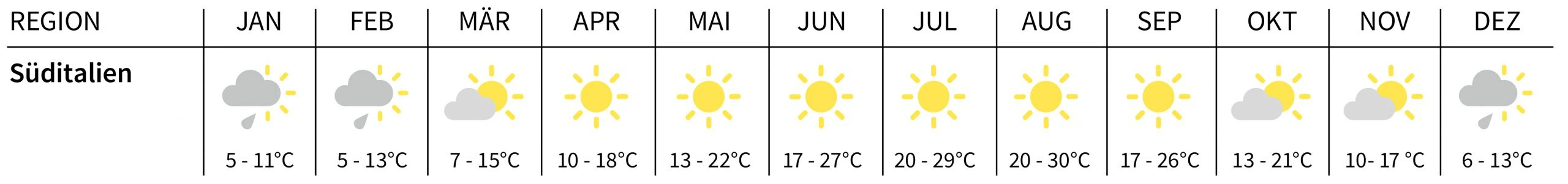 Ab Neapel und weiter südlich herrscht in Italien ein subtropisches Klima. In Süditalien fällt die Temperatur sogar in den kältesten Monaten kaum unter 17 Grad. Im Sommer steigt die Temperatur leicht bis auf 40 Grad. Wenn Sie durch den Süden Italiens reisen, folgen Sie dem ‚Flow‘ der Italiener und halten Sie während der Mittagshitze Pranzo (italienische Siesta).