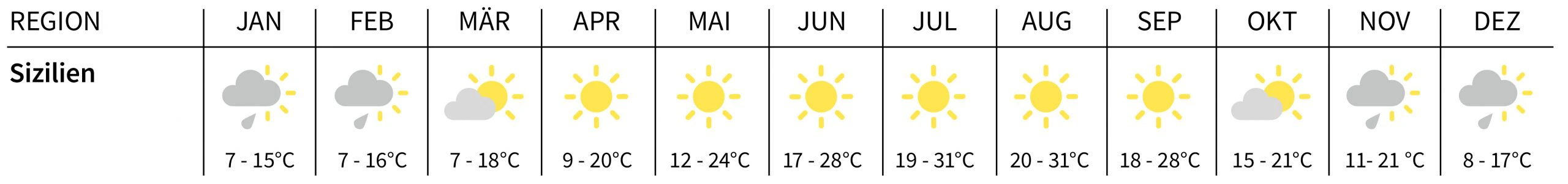 Das temperamentvolle Sizilien hat milde Winter und lange heiße Sommer, das Klima ist fast mit dem in Nordafrika zu vergleichen. Die Sonne scheint stark und grell und es fällt kein Tropfen Regen. In den Hügeln im Landesinnern und auf dem Ätna lässt es sich besser aushalten. Hier liegen die Temperaturen durchschnittlich etwa 5 Grad unter denen an der Küste.