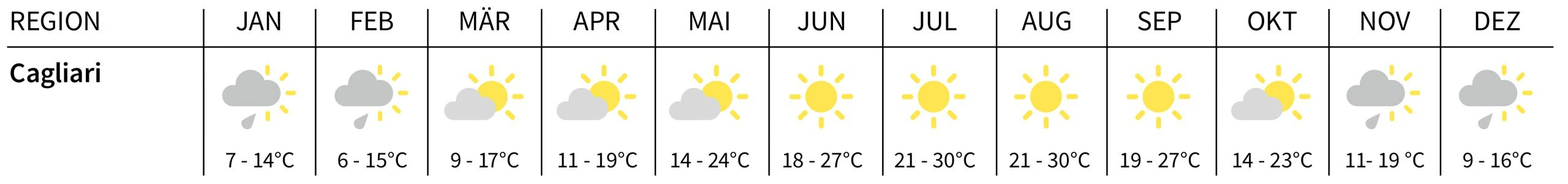 Auf Sardinien herrscht ein mediterranes Klima mit milden Wintern und trockenen, heißen Sommern. Juli und August sind die heißesten Monate; nicht selten steigen die Temperaturen deutlich über 30 Grad. Auch in den Monaten Juni und September liegen die durchschnittlichen Tagestemperaturen zwischen 25 und 30 Grad. Sardinien hat rund 300 Sonnentage im Jahr; die Regentage verteilen sich auf die Monate Oktober bis April. Generell gilt die Zeit von Mai bis Oktober als gute Reisezeit.