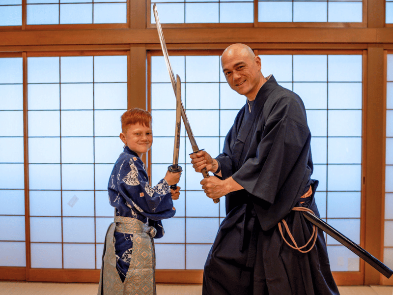 Wollen Sie sich direkt zu Beginn Ihrer Reise zu einem Samurai ausbilden lassen? Ihr Lehrer hilft Ihren Kindern und Ihnen dabei, die Kleidung richtig anzulegen, zeigt Ihnen, wie die Waffen zu halten sind und erklärt Ihnen die Grundschritte. Gemeinsam führen Sie auch einen kleinen gespielten Kampf durch. Keine Sorge – das alles passiert nur mit Holzschwertern. Zeit für ein Fotoshooting bleibt natürlich auch, und jeder erhält am Ende ein kleines Samurai-Zertifikat, eine schöne Erinnerung auf der gesamten Reise und darüber hinaus.