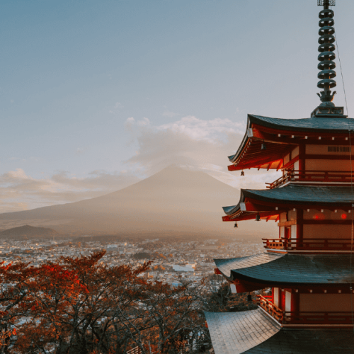 Im Frühling sind die Temperaturen in Japan angenehm mild und liegen je nach Region zwischen 15 und 23 Grad Celsius – ideal für ausgedehnte Spaziergänge in Parks, eine Fahrradtour durch Kyoto oder um sich die Tempel umgeben von den leuchtenden Blüten anzuschauen. Ein beliebtes Ausflugsziel zu jeder Zeit ist der Mount Fuji. Im Frühling ist er ein besonders schönes Fotomotiv in Kombination mit den leuchtenden Kirschblüten.