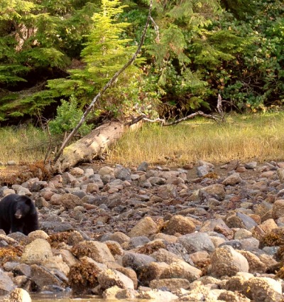 Am dritten Tag werden Sie hoffentlich noch mehr wilde Tiere sehen. In Kanada leben überall Bären. Man kann ihnen regelmäßig am Straßenrand begegnen. Oft stehen Sie dann in einer langen Schlange mit anderen Autofahrern, die alle ein gutes Foto machen möchten. Um die Bären noch besser kennen zu lernen, machen Sie heute eine Tour und sehen die beeindruckenden Tiere hoffentlich von ganz Nahem. Sie fahren morgens oder mittags, je nach den Gezeiten, in etwa 40 Minuten von Ucluelet nach Tofino. Vergessen Sie Ihr Fernglas nicht! Erst gehen Sie zusammen mit Ihrem Guide zum Strand. Hier erfahren Sie, wie die Bären ihr Essen suchen. Danach ziehen Sie sich etwas Warmes an und fahren mit einem Zodiac Boot zu den Fjorden. Bei Ebbe gehen die Bären am Strand auf Nahrungssuche. Nachdem wir eine Zeit lang Ausschau gehalten haben – es sind schließlich wilde Tiere – sahen wir einen Schwarzbären mit zwei Bärenkindern! Psst… still sein, denn sonst bekommt der Bär einen Schrecken. Auf der Suche nach Krabben hebt er geduldig Stein um Stein hoch. Aus etwa 10 m Abstand sahen wir staunenden Augen zu…