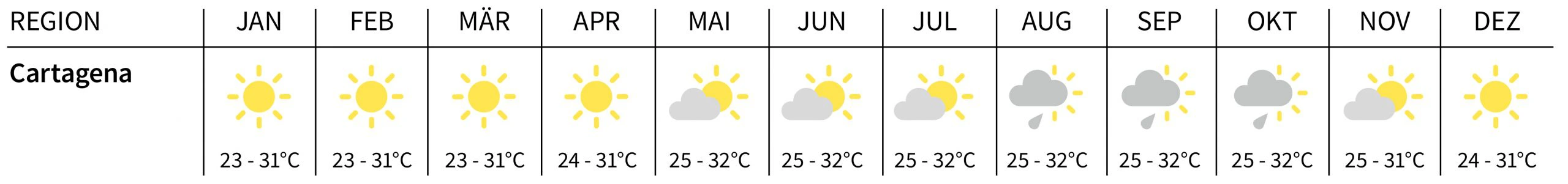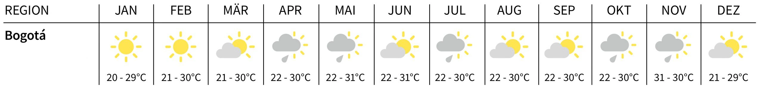 In Kolumbien gibt es üblicherweise zwei Trockenzeiten und zwei Regenzeiten. Während es zwischen Dezember bis März fast überall sonnig und eher trocken ist, nährt das Land sich von den Regenfällen von April bis Juni sowie Oktober und November. Im Juli und August ist das Wetter meist angenehm mild, doch der ein oder andere Schauer kann Ihnen auch hier während Ihrer Kolumbien Rundreise begegnen.