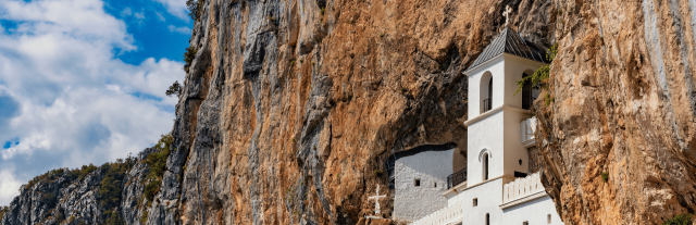 Wie durch ein Wunder scheint das Kloster Ostrog senkrecht in einer weißen Felswand zu kleben. Es ist der wichtigste orthodoxe Wallfahrtsort des Balkans und zieht jährlich hunderttausende Besucher aller Glaubensrichtungen an. Das im 17. Jahrhundert gegründete Kloster besteht aus einem unteren Teil und dem spektakulären oberen Kloster, das direkt in eine Kaverne des Berges Prekornica hineingebaut wurde.
