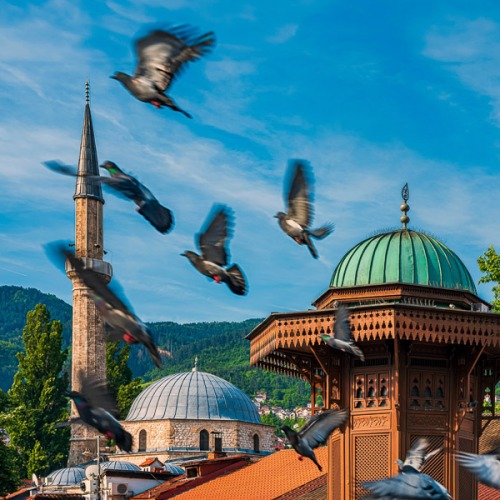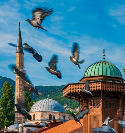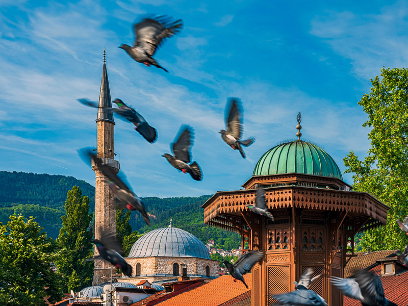 Sarajevo ist eine Stadt der Kontraste. Kirchen, Moscheen und Synagogen liegen hier fast nebeneinander – ein Symbol für die jahrhundertelange kulturelle Vielfalt. Unternehmen Sie einen Spaziergang durch die alte Basarstraße Baščaršija, vorbei am österreichisch-ungarischen Rathaus und zur Lateinerbrücke, an der 1914 das Attentat auf Franz Ferdinand verübt wurde – der Auslöser des Ersten Weltkriegs. Auch die jüngere Geschichte ist spürbar: Im Tunnelmuseum erfahren Sie mehr über die Belagerung der Stadt in den 1990er-Jahren. Neben der bewegten Vergangenheit präsentiert sich Sarajevo heute lebendig und modern, mit angesagten Cafés, Straßenkunst und Musikfestivals. Trinken Sie einen traditionellen bosnischen Kaffee aus einer kupfernen Džezva und probieren Sie frischen Burek in einer lokalen Bäckerei.