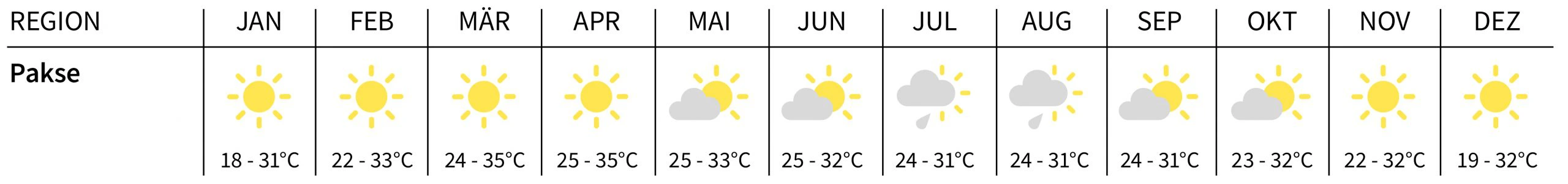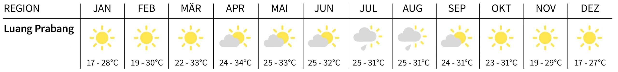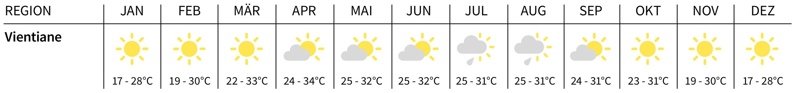 Das Wetter in Laos ist warm und tropisch. Das ganze Jahr über beträgt die Temperatur um die 30 Grad, in den Monaten April und Mai kann sie sogar auf 40 Grad steigen. Regenzeit ist von Mai bis Oktober, aber auch in diesem Zeitraum kann man gut durch Laos reisen. Wegen der Luftfeuchtigkeit, die in der Monsunzeit höher ist, ist auch die gefühlte Temperatur höher und das Reisen kann etwas anstrengender sein. Die beste Reisezeit ist die Trockenperiode von November bis Februar.