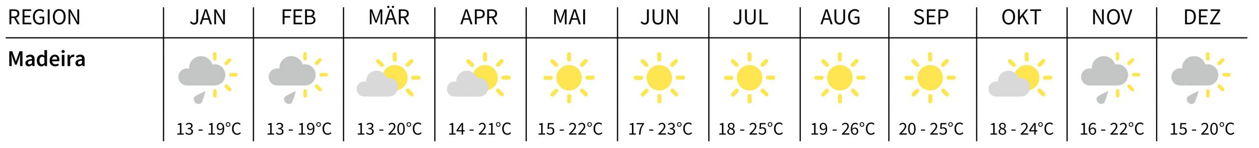 Madeira ist das ganze Jahr über gut bereisbar. Die wärmste und trockenste Zeit ist der Sommer mit Temperaturen um angenehme 25° C und einer Wassertemperatur von 23° C. Im Frühjahr und Herbst beträgt die Durchschnittstemperatur 20-23° C und im Winter sinkt die Temperatur auf 16-20° C. Auch im Winter können Sie dort im Meer schwimmen, die Wassertemperatur beträgt im Oktober noch 20° C und fällt im Winter nicht unter 18° C. Die Abende und Nächte sind oft sehr angenehm: Im Sommer nicht zu heiß und es kühlt nicht übermäßig ab. Somit herrschen ganzjährig ideale Bedingungen für eine Madeira Rundreise. Die Hochsaison auf Madeira ist Anfang Mai, die beliebteste (Blüte-) Zeit, und die Schulferien. Da Madeira einen ewigen Frühling hat, werden Sie auch das ganze Jahr über Blumen blühen sehen.