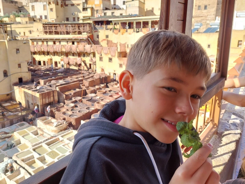 Und so sind wir für 10 Tage in den Herbstferien in eine ganz andere Welt abgetaucht. Zumal der Oktober für Marokko eine ideale Reisezeit ist. Nicht mehr zu heiß und dennoch sehr angenehme Temperaturen. Als Start unseres Familienurlaubs in Marokko haben wir Fes ausgesucht – ein wirklich idealer Ausgangspunkt für uns. Die Stadt ist selber viel gemütlicher als Marrakech und so hatten wir einen ruhigen Start. Vor allem haben unsere Kinder große Augen gemacht, als es bei der Stadtführung durch das Labyrinth der Souks und der Medina ging. Überall verwinkelte Gassen, hier werden Tücher verkauft, da Porzellan, an der nächsten Ecke Obst und Gemüse und man lässt sich schnell mitreißen und taucht tief in das dortige Leben ein. Die Kids haben nicht schlecht gestaunt, dass uns hin und wieder Mulis mit Baumaterialen oder Müll beladen in den engen Gassen entgegen kamen. Aber durch die Gassen passen keine Autos und schon gar keine Laster oder Müllwagen. Einen bleiben Eindruck haben die Färberbecken in Fes bei uns hinterlassen. Am Eingang gab es für jeden einen Stängel Minze, den man sich unter die Nase halten sollte. Denn die Gerüche sind etwas gewöhnungsbedürftig, selbst mit etwas Abstand.