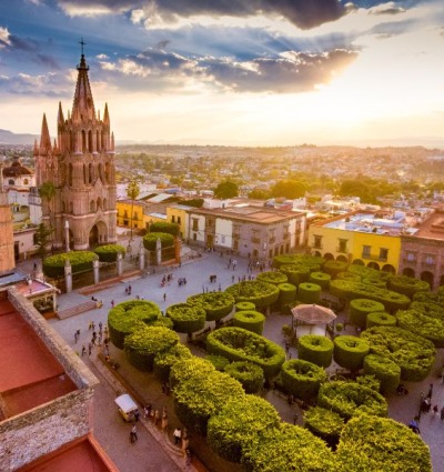 San Miguel de Allende gilt als eine der schönsten Städte Mexikos. Die koloniale Architektur, das farbenfrohe Zentrum und die lebendige Kunstszene machen den Ort einzigartig. Kein Wunder, dass die Altstadt zum UNESCO-Weltkulturerbe zählt. Besonders eindrucksvoll ist die Calle Aldama, oft als schönste Straße Mexikos bezeichnet: bunte Häuser, wehende Fahnen und der Blick auf die markante Parroquia-Kirche, deren heutige, neugotische Fassade im Jahr 1880 entstand.