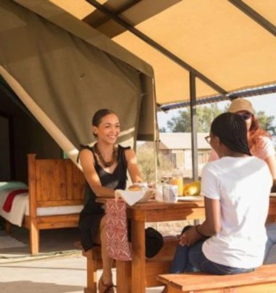 Mitten in der Namib-Wüste, etwa 60 km vom Eingang zum Sossusvlei entfernt, zu übernachten, ist ein Abenteuer für sich. Abends zünden Sie gemeinsam den Grill an, lauschen den Geräuschen der Natur und hören vielleicht in der Ferne eine Hyäne. Die Zelte befinden sich an einem ruhigen Ort in der Nähe der Lodge, wo Sie auch schwimmen und essen können. Gehen Sie früh schlafen, denn das Tor zum Sossusvlei öffnet sich bereits am frühen Morgen. Dann färben sich die Sanddünen leuchtend rot, und Sie können zur Düne 45 hinaufklettern – der Ausblick von oben ist es absolut wert! Um Sie herum erstrecken sich kilometerlange Dünen, und eingebettet in diese wachsen uralte, einzigartige Bäume, die hier seit Jahrhunderten stehen.