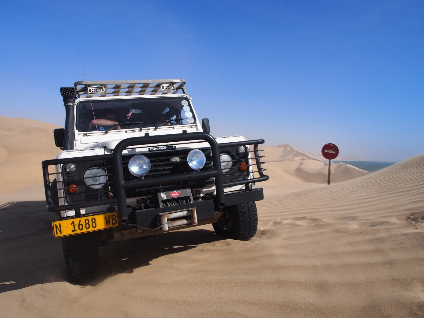 Zu beachten in Sossusvlei ist, dass der Sand hier sehr fein ist und daher die Kamera oder sonstige Technik beschädigen kann. Am liebsten sollte man die Kamera ständig in einer Stofftasche tragen und nur bei Bedarf herausholen. Auch ein Objektivwechsel ist in der Wüste nicht zu empfehlen. Da sich der Sand tagsüber enorm erhitzt und ein Dünenanstieg in den Schuhen nicht so bequem ist, sollte man daran denken, feste Wandersocken mitzunehmen und diese beim Anstieg anzuziehen. Am Sossusvlei und Deadvlei hat unser Weg natürlich noch nicht aufgehört. Diesen Abend ließen wir in einem schönen Hotel mit Pool ausklingen. Am nächsten Tag sind wir begleitet vom Muskelkater weiter Richtung Süden gefahren. Unsere nächste Station war Swakopmund – die direkt am kalten Atlantik liegende Stadt. Verwöhnt von den wunderschönen Landschaften der Vortage, haben wir uns sehr über das langweilig graue sandige Flachland auf dem Weg nach Swakopmund gewundert. Doch die Stadt selbst ist sehr nett und es gibt hier einige unterhaltsame Ausflüge, von denen wir einige unternommen haben. Zum einen haben wir uns hier sportlich betätigt und das Sandboarden in den nahe liegenden (diesmal „normal“ gelben) Sanddünen ausprobiert. Nach dieser ziemlich sandigen Erfahrung sind wir weiter nach Walvis Bay gefahren und haben uns hier einem geübten Dünenfahrer anvertraut. Mit einem Jeep sind wir die Dünen hoch und runter gefahren und haben das märchenhafte Zusammenkommen der Wüste mit dem Ozean genossen.