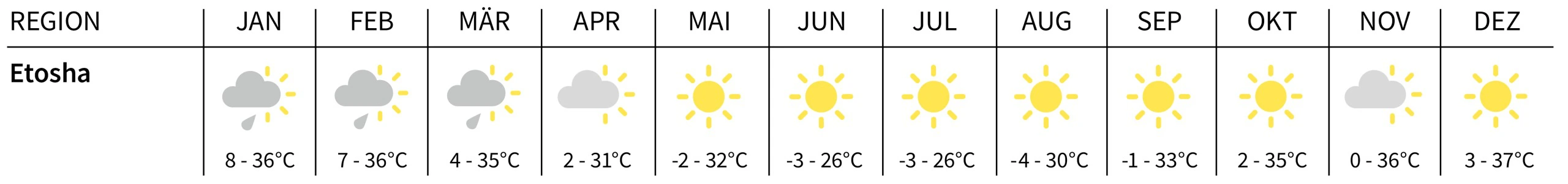 Namibia ist ein sehr sonniges Land, das sich das ganze Jahr über gut bereisen lässt. Dennoch gibt es auch hier vorteilhaftere Reisezeiten.