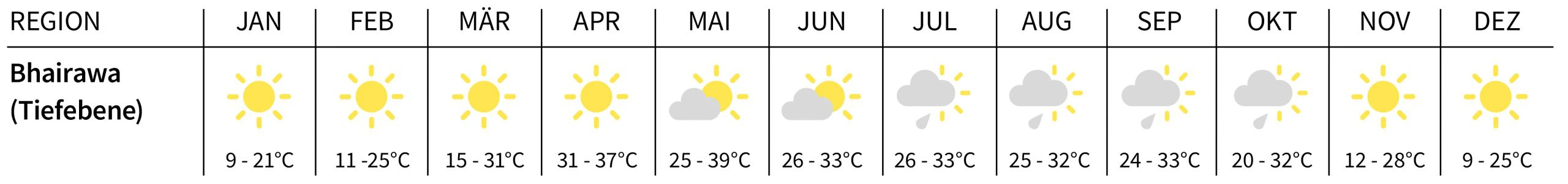 Das Klima in Nepals Tieflandregionen lässt sich als (sub)tropisch bezeichnen. Der Chitwan Nationalpark liegen zum Beispiel im Tiefland. Die Sommer sind hier heiß und feucht- dabei können die Temperaturen tagsüber durchaus bis auf 40 Grad Celsius steigen. Insbesondere bevor der Monsun beginnt, also im April/ Mai, kann es drückend heiß sein. Dann bietet es sich an, sich bei einem Raften über den Trisuli Fluss etwas Abkühlung zu holen. Die Winter in der Tiefebene sind dafür mild und trocken bei einer Mindesttemperatur von etwa 10 Grad Celsius während der Nacht und etwa 20 Grad tagsüber.
