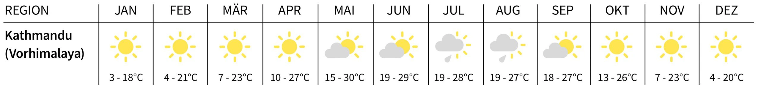 Die Jahreszeiten sind in etwa identisch mit denen in Europa: Von Dezember bis Februar herrschen überwiegend niedrige Temperaturen, während es besonders von April bis Juni sehr heiß ist. Die restlichen Monate sind mild. Nepal ist und bleibt jedoch ein Land der Extreme mit einem trockenen Winter und einem heißen und feuchten Sommer. Aufgrund der extremen Höhenunterschiede und unterschiedlichen Landschaftstypen gibt es über das Land verteilt unterschiedliche Klimazonen.