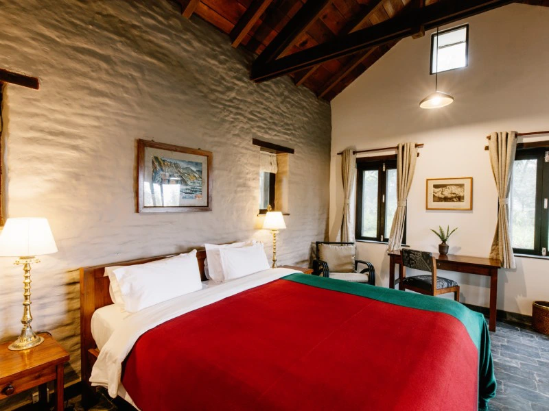Die Cottages wurden aus natürlichen Materialien gebaut, sodass sie sich harmonisch in die Umgebung einfügen. Die großzügigen Zimmer verfügen über Holzelemente, traditionelle nepalesische Details und private Balkone. Die Lodge ist außerdem für ihr Engagement im verantwortungsvollen Tourismus bekannt: Sie beschäftigt und unterstützt lokale Gemeinschaften, bezieht viele Produkte aus der Umgebung und fördert Projekte in den Bereichen Naturschutz und Bildung.