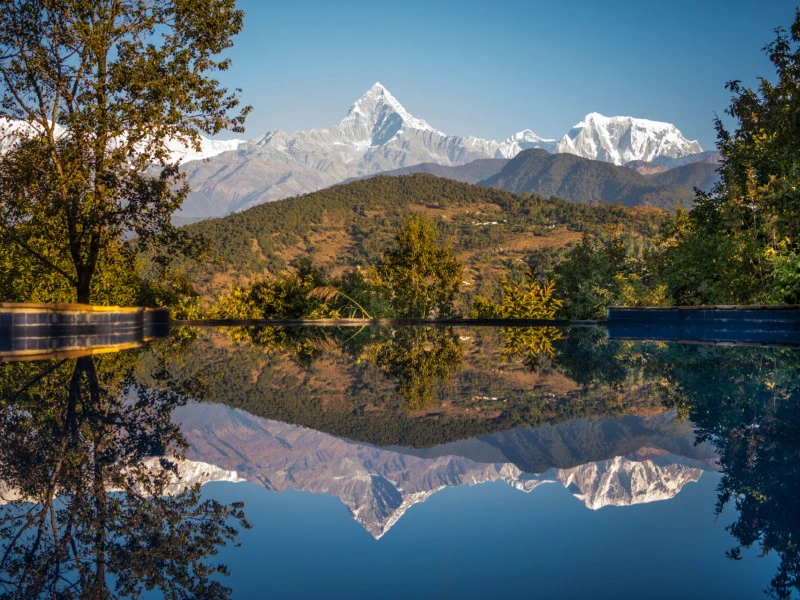 Wenn Sie etwas Einzigartiges und ganz Besonderes suchen, können Sie Ihr Programm in Pokhara mit unserer besonderen Unterkunftsoption aufwerten. Auf einem bewaldeten Bergrücken gelegen, etwa 30 Minuten Fahrt von Pokhara entfernt, bietet diese Boutique-Lodge beeindruckende Ausblicke auf das Annapurna Range und den markanten Gipfel des Machhapuchhre.