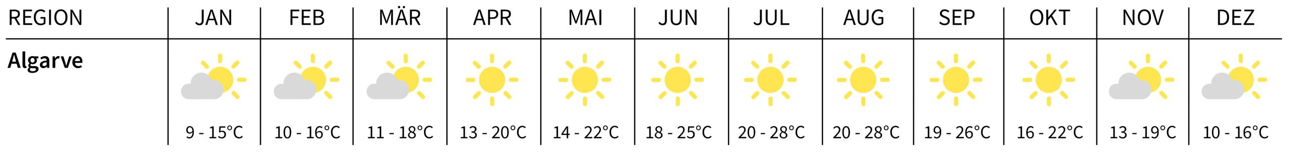 Im Winter können Sie bei etwa 16°C zwar nicht in Ihren Badesachen am Strand liegen, aber trotzdem die milden, sonnigen Tage genießen, während es bei uns schon friert. Obwohl es im Winter an der Atlantikküste oft regnet, ist die Algarve mit 300 Sonnentagen pro Jahr ganzjährig ein attraktives Reiseziel.