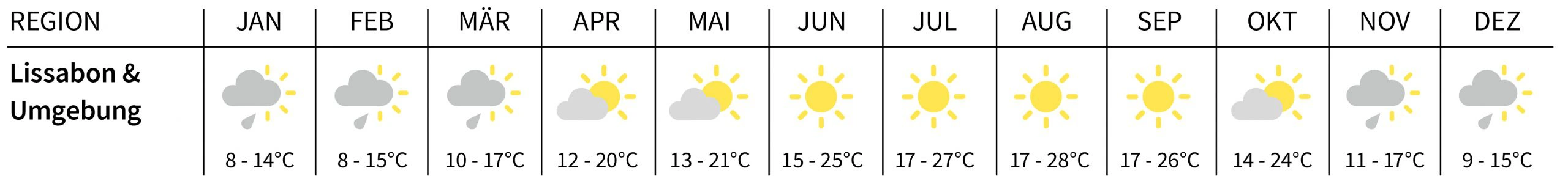 Lissabon hat ein mildes Klima mit langen und warmen Sommern und Temperaturen um 27°C im Juli und August. In den Sommermonaten ist es sehr heiß und voll in der Stadt. Das Frühjahr und der Herbst sind die besten Zeiten, Lissabon zu erkunden. Im Frühjahr liegt die Temperatur zwischen 10° und 18°C. Im Herbst ist es etwas wärmer mit einer Temperatur zwischen 11° und 25°C. Beim Spaziergang durch die Hauptstadt reicht dann eine leichte Sommerjacke aus. Lissabon ist eine hügelige Stadt, in den höher gelegenen Teilen kann es oft etwas kühler sein. Auch der Rio Tejo hat Einfluss auf das Wetter und sorgt in der Regel für eine etwas niedrigere Temperatur in der Stadt.