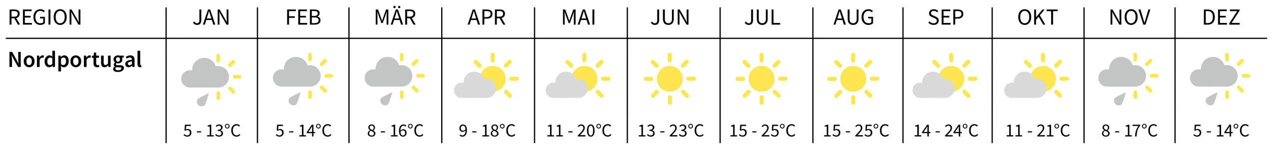 Nordportugal ist die grünste Region des Landes mit weiten Tälern, unzähligen Weingärten und dichten Wäldern. Hier oben befindet sich auch Portugals einziger Nationalpark, der Peneda-Gerês. Das gemäßigte Meeresklima sorgt für ein trockenes, heißes Wetter in der Küstenregion bei Porto mit einer Durchschnittstemperatur zwischen 25°C und 29°C. Im Winter kann es hier regnerisch und kühl (14°C) sein, deshalb ist diese Region auch so herrlich grün. Im Landesinneren wird es viel heißer, da das Meer hier weniger Einfluss hat. Im Juli und August steigen die Temperaturen auf über 40°C. Daher sind der Frühling und auch der Herbst die beste Reisezeit für den Norden.