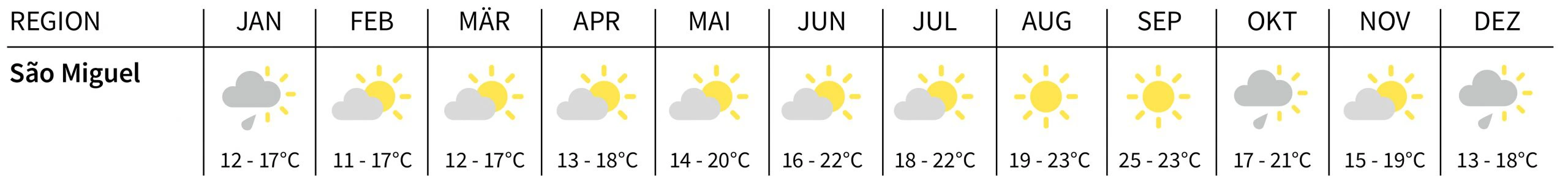 Die Inselgruppe der Azoren kann grundsätzlich ganzjährig bereist werden. Durch Ihre Lage mitten im Atlantik sind die Temperaturschwankungen zwischen den einzelnen Monaten gering. Die Sommermonate sind in der Regel am wärmsten und auch am besten für eine Azoren Rundreise geeignet. Planen Sie Ihre Reise idealerweise zwischen Mai und Oktober.