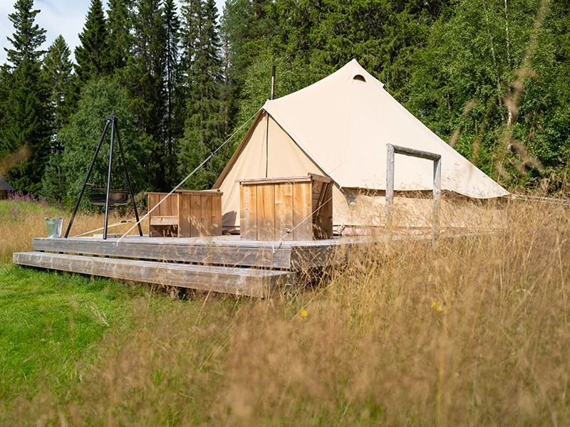 Das Abenteuer beginnt im Basecamp bei Dalsvallen, direkt außerhalb des Sonfjället‑Nationalparks, wo ihr in einem stimmungsvollen Glamping‑Zelt übernachtet. Ihr kocht euer Wasser selbst, um Kaffee zuzubereiten, hackt euer eigenes Holz für das Lagerfeuer oder zum Heizen des Ofens im Zelt an kälteren Tagen.