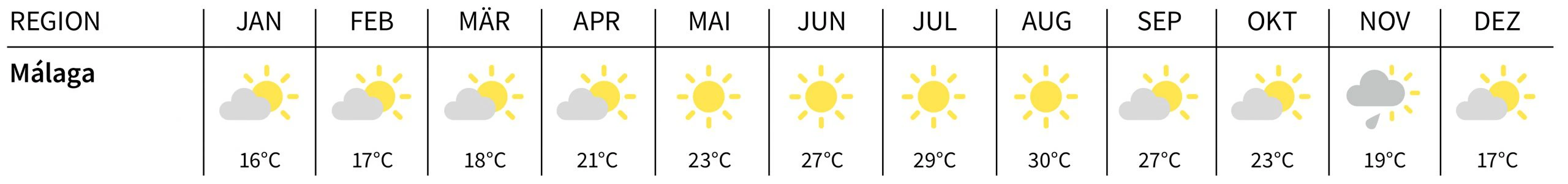 Das Klima in Andalusien im Winter ist mit durchschnittlich 20°C viel milder als in Deutschland – die perfekte Reisezeit also, wenn Sie dem Winter für eine Weile entfliehen wollen. Jetzt wird am Abend jedoch auch ein Pullover notwendig, denn bei etwa 10°C reicht das T-Shirt leider nicht mehr.