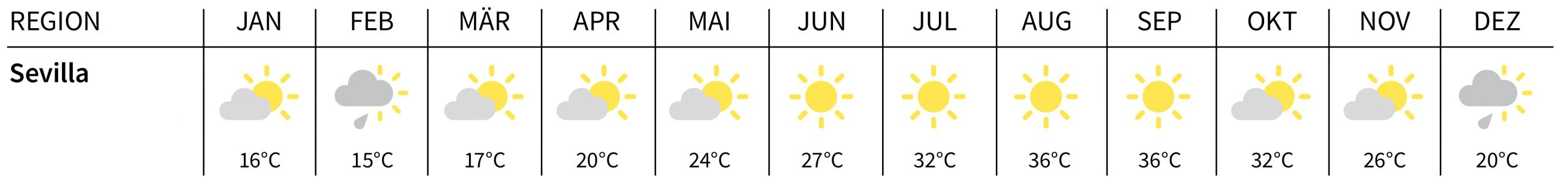 Auf dieser Seite finden Sie Information zu den klimatischen Verhältnissen in Spanien bezogen auf die beiden Regionen, die wir aktuell anbieten: Andalusien, Nordspanien und die Kanaren. Der beste Zeitraum für eine Reise nach Spanien variiert je nach Region: