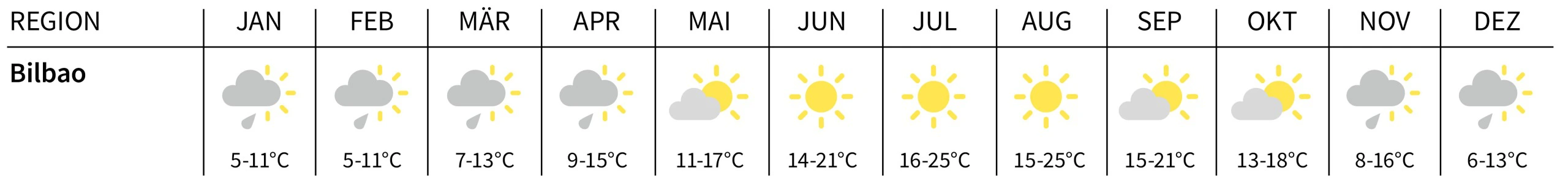 Das Klima in Nordspanien ist durch den Atlantik geprägt und somit deutlich milder und feuchter als im Süden des Landes. In und um Bilbao erwarten Sie grüne Hügellandschaften, wilde Küstenabschnitte und angenehme Temperaturen – perfekt für aktive Erkundungen, Wanderungen und Städtetrips.